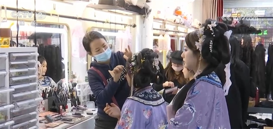 這股國潮風(fēng)也帶動(dòng)了南京漢服的租賃、妝造等周邊產(chǎn)業(yè),離老門東很近的剪子巷,500米左右的巷子就有20家左右的漢服租賃店。