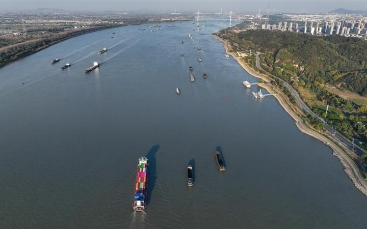 船只行駛在長(zhǎng)江南京段(11月2日攝,無人機(jī)照片)。記者 季春鵬 攝