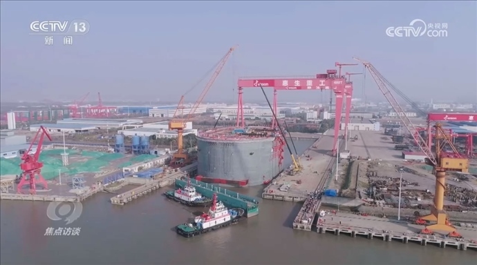 這是6號墩鋼沉井,這個龐然大物在制造完成后,由拖船拖入長江航道、到達(dá)預(yù)定位置。