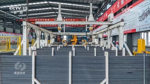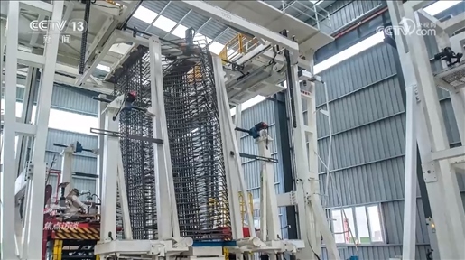 中交二航局常泰長江大橋項目部常務(wù)副經(jīng)理王輝:“傳統(tǒng)的橋塔鋼筋怎么做呢?通過吊機(jī)把鋼筋吊到塔上,作業(yè)工人一根根把鋼筋綁起來,個人能力有差別,質(zhì)量和精度,鋼筋間距也很難控制,現(xiàn)在我們采用什么理念呢?就是部品的理念,把塔的鋼筋在下面做成一塊一塊的,就像搭積木一樣,大型吊機(jī)把它吊上去,然后一節(jié)節(jié)堆起來。”