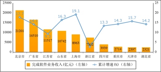 主要軟件大省收入占比持續(xù)提升。1—10月份,軟件業(yè)務收入居前5名的省份中,北京市、廣東省、江蘇省、山東省、上海市軟件收入分別為21201億元、16510億元、11517億元、10742億元和8963億元,分別增長17.7%、14.1%、9.3%、16.3%和19.1%,五?。ㄊ校┖嫌嬡浖I(yè)務收入68933億元,占全國比重為70.2%,占比較去年同期提高1個百分點。