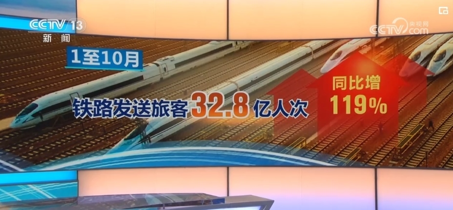 國鐵集團(tuán)最新數(shù)據(jù)顯示,2023年前10個月,全國鐵路發(fā)送旅客32.8億人次,同比增長119%。其中,9月份,全國鐵路單日售票量、單日旅客發(fā)送量均創(chuàng)歷史新高。