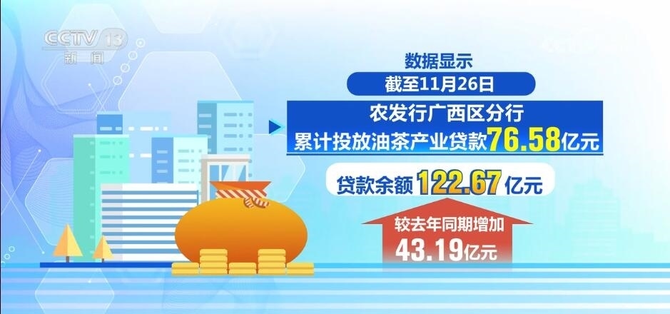 數(shù)據(jù)顯示,截至11月26日,農(nóng)發(fā)行廣西區(qū)分行累計投放油茶產(chǎn)業(yè)貸款76.58億元,貸款余額122.67億元,較去年同期增加43.19億元。