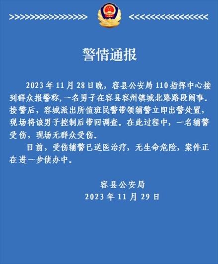 ·廣西容縣警方通報(bào)“男子鬧事致輔警受傷”:已將其帶回調(diào)查,輔警無生命危險(xiǎn)。