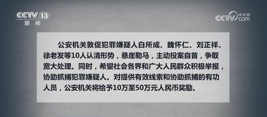 公安機(jī)關(guān)敦促犯罪嫌疑人白所成、魏懷仁、劉正祥、徐老發(fā)等10人認(rèn)清形勢(shì),懸崖勒馬,主動(dòng)投案自首,爭(zhēng)取寬大處理。同時(shí),希望社會(huì)各界和廣大人民群眾積極舉報(bào),協(xié)助抓捕犯罪嫌疑人。對(duì)提供有效線(xiàn)索和協(xié)助抓捕的有功人員,公安機(jī)關(guān)將給予10萬(wàn)至50萬(wàn)元人民幣獎(jiǎng)勵(lì)。