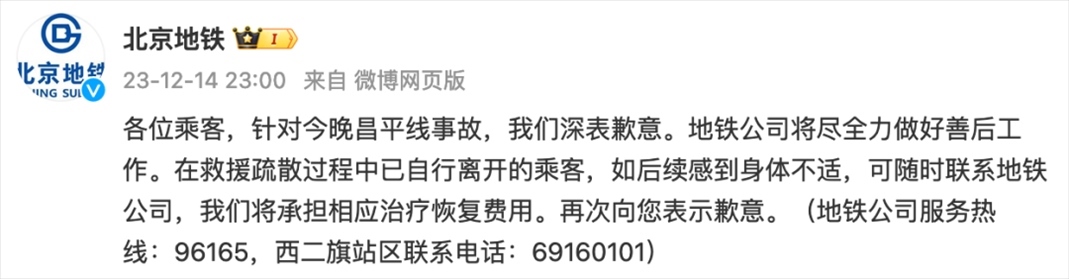 ·12月14日晚,北京地鐵昌平線事故導(dǎo)致30余人受傷,無人員死亡。北京地鐵發(fā)布微博致歉:將承擔(dān)相應(yīng)治療恢復(fù)費(fèi)用。