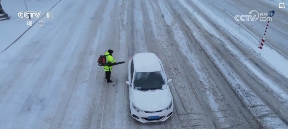 交警身背吹風設備 路口吹去車上積雪