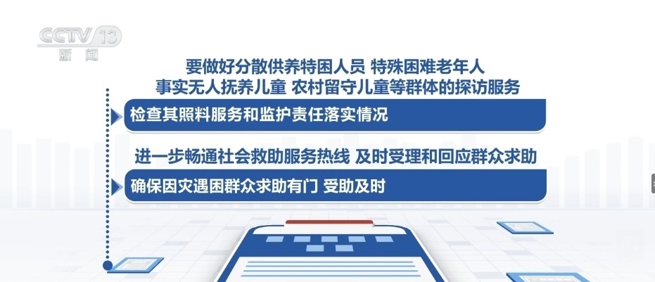 要做好分散供養(yǎng)特困人員、特殊困難老年人、事實無人撫養(yǎng)兒童、農(nóng)村留守兒童等群體的探訪服務(wù),檢查其照料服務(wù)和監(jiān)護(hù)責(zé)任落實情況。進(jìn)一步暢通社會救助服務(wù)熱線,及時受理和回應(yīng)群眾求助,確保因災(zāi)遇困群眾求助有門、受助及時。
