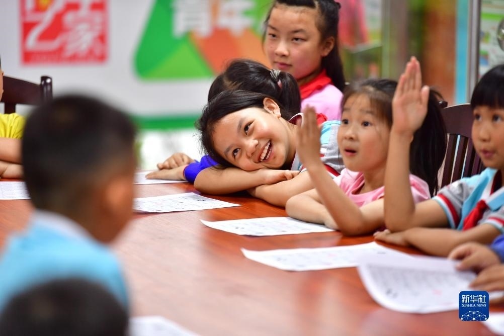 在廣西柳州市融水苗族自治縣易地扶貧搬遷安置小區(qū)苗家小鎮(zhèn)青年之家“六點小課堂”,孩子們參與興趣活動(2022年5月5日攝)。近年來,廣西柳州市融水苗族自治縣團縣委在易地扶貧搬遷安置小區(qū)苗家小鎮(zhèn)、苗美社區(qū)開設(shè)青年之家“六點小課堂”,定期組織青年志愿者,為這里的青少年開展功課輔導(dǎo)、自護教育、科技小課堂等活動。新華社記者 黃孝邦 攝