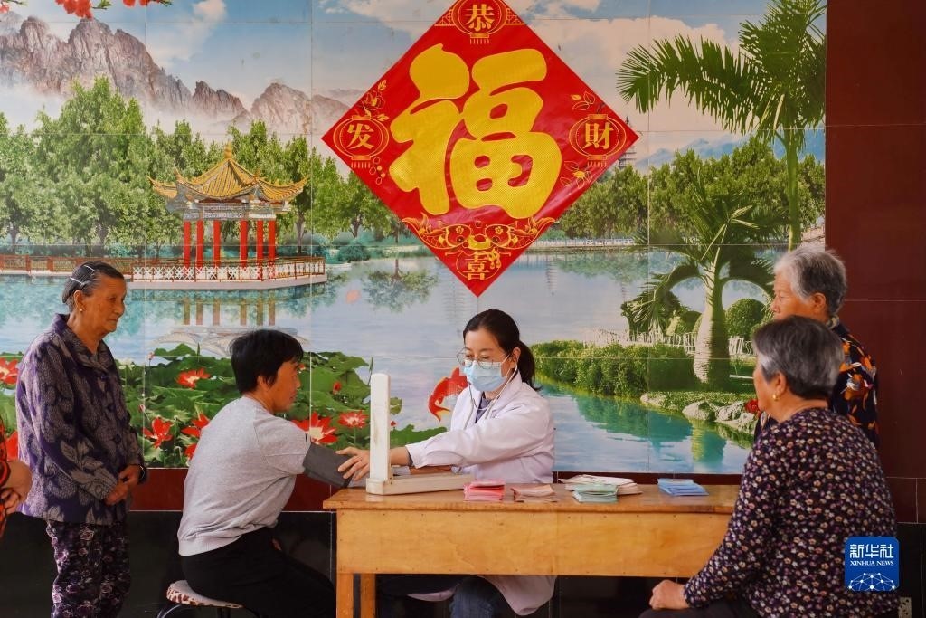 河北省平鄉(xiāng)縣尋召村村醫(yī)在“幸福小院”內(nèi)為老人們量血壓(2023年4月20日攝)。近年來,河北省平鄉(xiāng)縣利用農(nóng)村閑置院落,按照“就近集中、鄰里互助、抱團養(yǎng)老”的模式,采取社會捐助、鄉(xiāng)村籌集、縣財政補助等形式,先后打造出300余個“幸福小院”。新華社記者 牟宇 攝