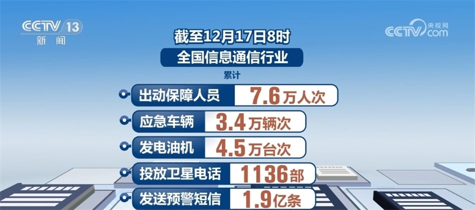據(jù)了解,截至12月17日8時(shí),全國信息通信行業(yè)累計(jì)出動(dòng)保障人員7.6萬人次、應(yīng)急車輛3.4萬輛次、發(fā)電油機(jī)4.5萬臺(tái)次、投放衛(wèi)星電話1136部、發(fā)送預(yù)警短信1.9億條。全國通信網(wǎng)絡(luò)整體運(yùn)行平穩(wěn),累計(jì)3053座基站退服,已修復(fù)2933座,未發(fā)生鄉(xiāng)鎮(zhèn)級(jí)通信全阻。