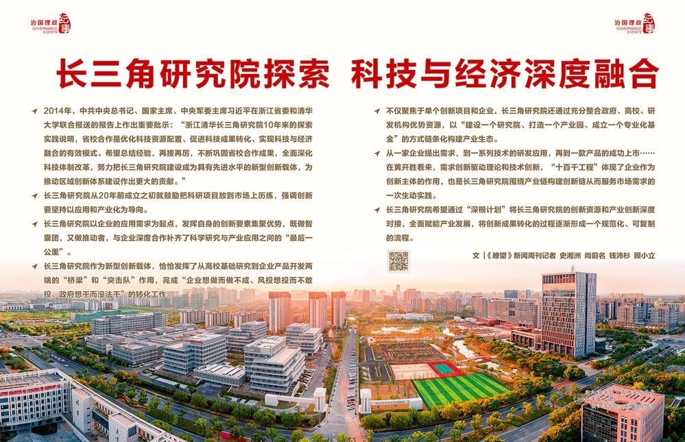 2014年,中共中央總書記、國(guó)家主席、中央軍委主席習(xí)近平在浙江省委和清華大學(xué)聯(lián)合報(bào)送的報(bào)告上作出重要批示:“浙江清華長(zhǎng)三角研究院10年來的探索實(shí)踐說明,省校合作是優(yōu)化科技資源配置、促進(jìn)科技成果轉(zhuǎn)化、實(shí)現(xiàn)科技與經(jīng)濟(jì)融合的有效模式。希望總結(jié)經(jīng)驗(yàn),再接再厲,不斷鞏固省校合作成果,全面深化科技體制改革,努力把長(zhǎng)三角研究院建設(shè)成為具有先進(jìn)水平的新型創(chuàng)新載體,為推動(dòng)區(qū)域創(chuàng)新體系建設(shè)作出更大的貢獻(xiàn)?!?/p>