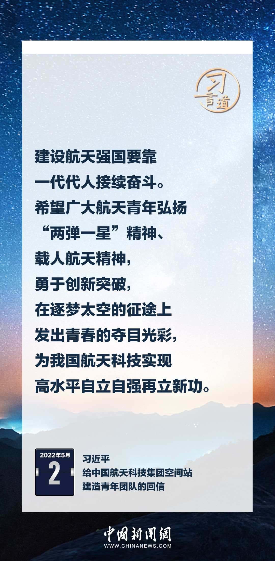 建設(shè)航天強(qiáng)國(guó)要靠一代代人接續(xù)奮斗。在不同場(chǎng)合,習(xí)近平總書記頻頻提及航天精神,激勵(lì)一代代中國(guó)人不斷奮進(jìn)、筑夢(mèng)太空。