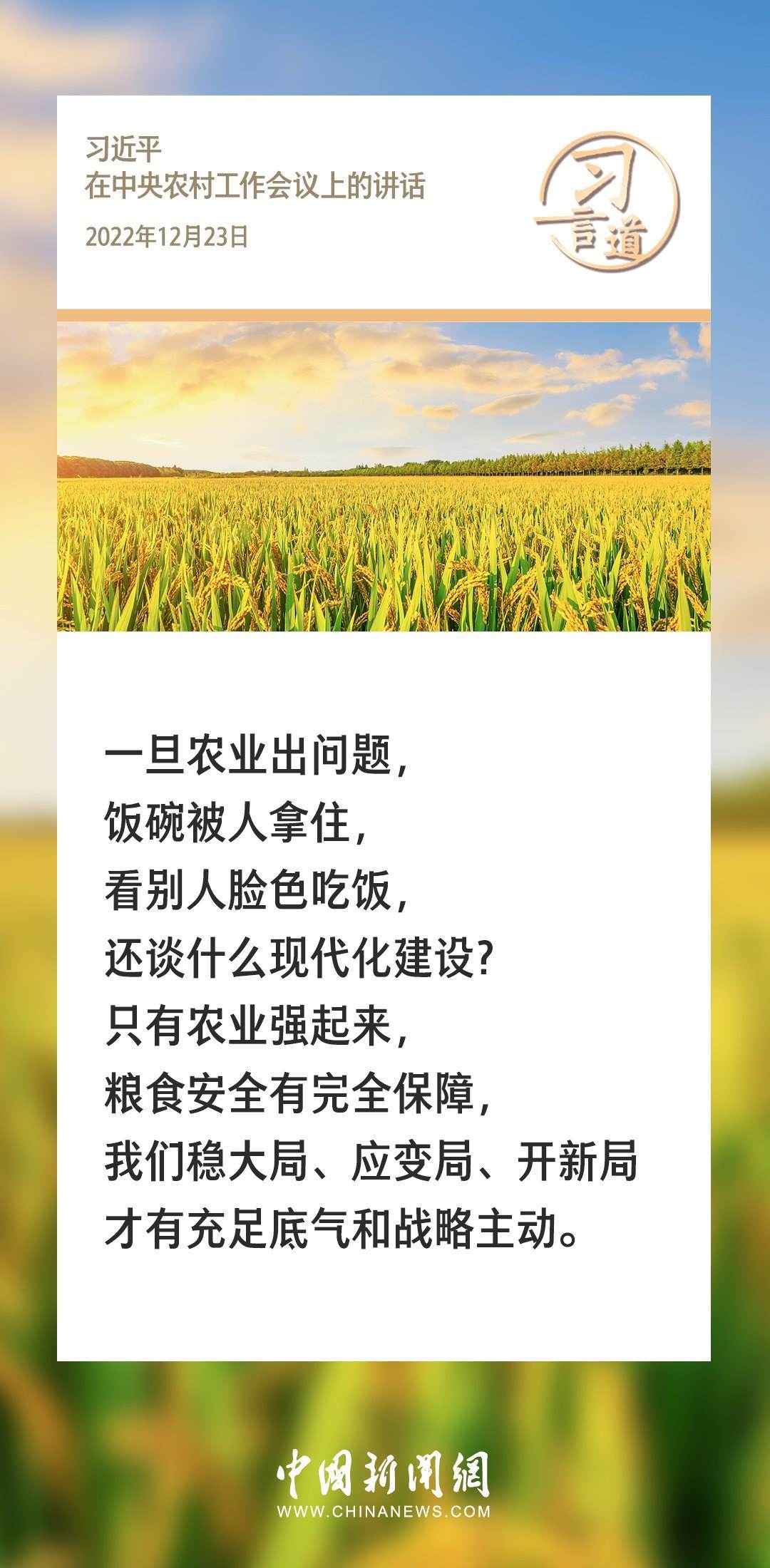 農(nóng)為邦本,本固邦寧。習(xí)近平總書記多次在不同場合就“三農(nóng)”工作發(fā)表重要講話、作出重要部署,始終堅(jiān)持把解決好“三農(nóng)”問題作為全黨工作的重中之重。