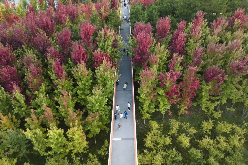 10月7日,市民在陜西西安雁南公園內(nèi)駐足觀景(無人機照片)。
