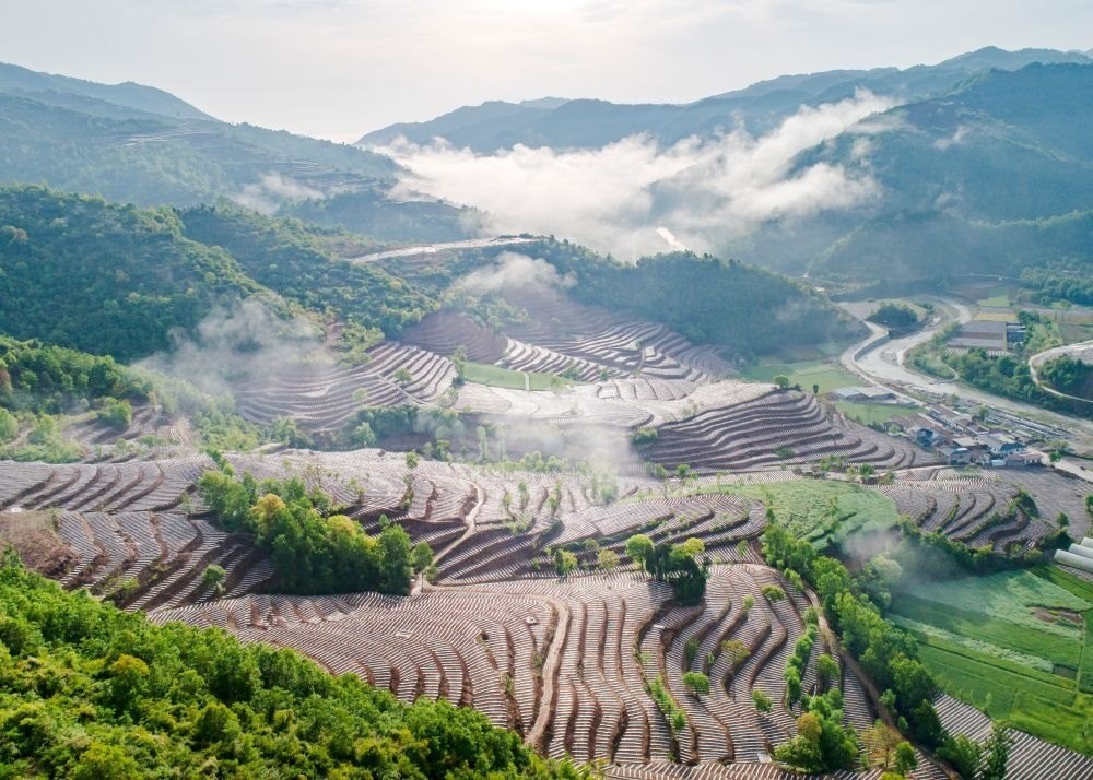 陜西省漢中市略陽縣郭鎮(zhèn)譚家莊村綜合治理后的梯田(4月26日攝,無人機照片)。