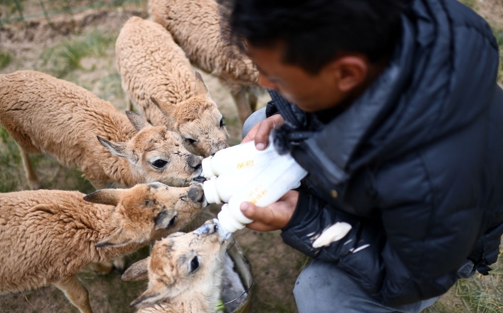青海三江源國家公園可可西里管理處索南達杰保護站隊員才仁多杰在給被救助的藏羚羊幼仔喂奶(7月28日攝)。