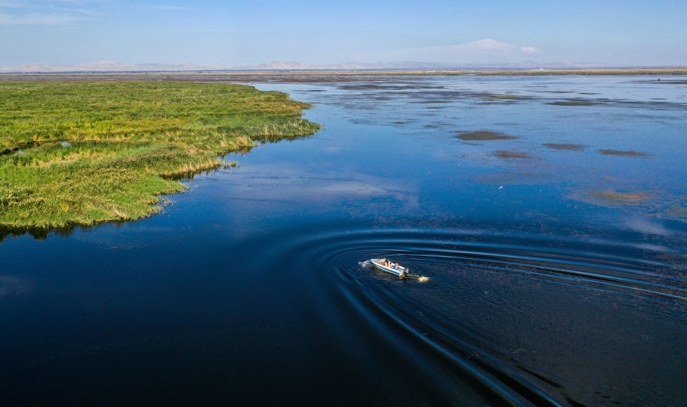 9月15日,在內(nèi)蒙古烏梁素海湖面上,河湖濕地水環(huán)境保護與修復技術(shù)研究團隊成員乘坐快艇去采集湖水樣本(無人機照片)。