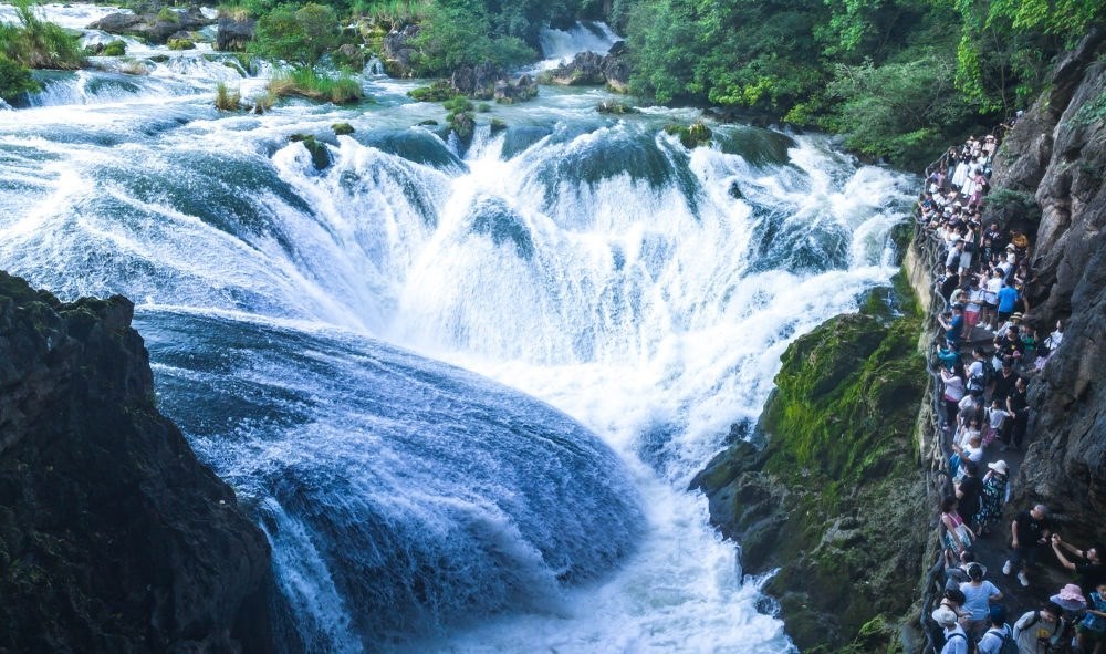 8月16日,游客在貴州省安順市黃果樹瀑布景區(qū)游覽(無人機照片)。
