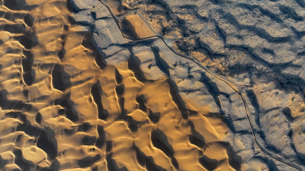 位于寧夏中衛(wèi)市沙坡頭騰格里沙漠邊緣的治沙林帶與沙漠交匯處(9月6日攝,無人機照片)。