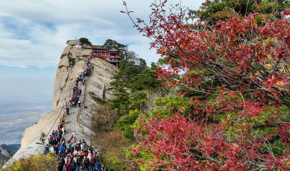 10月19日,游人在攀登西岳華山蓮花峰(無人機照片)。
