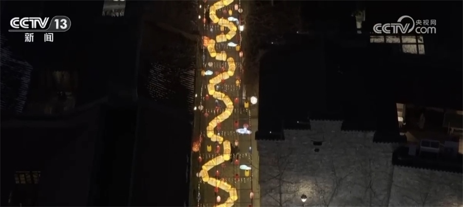 在老門東景區(qū),從空中俯瞰,一條長130多米的龍燈貫穿在巷子里,蜿蜒盤旋點(diǎn)亮了城市夜空。
