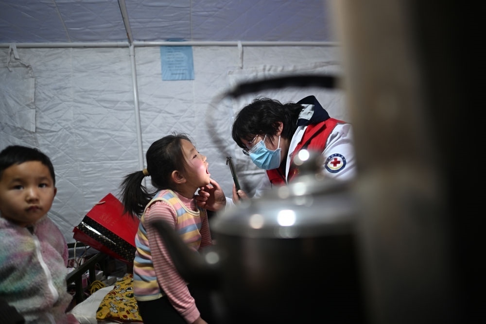 在青海省海東市民和回族土族自治縣官亭鎮(zhèn)喇家村安置點(diǎn),山東援青醫(yī)生李鴻皓(右)為喇生婷檢查身體(12月23日攝)。積石山6.2級地震發(fā)生以來,在青海省海東市民和回族土族自治縣,當(dāng)?shù)蒯t(yī)療機(jī)構(gòu)和援青醫(yī)療隊(duì)通過設(shè)立醫(yī)療點(diǎn)、開展巡診等方式保障安置點(diǎn)群眾就醫(yī)服務(wù),守護(hù)群眾健康。新華社記者 張宏祥 攝