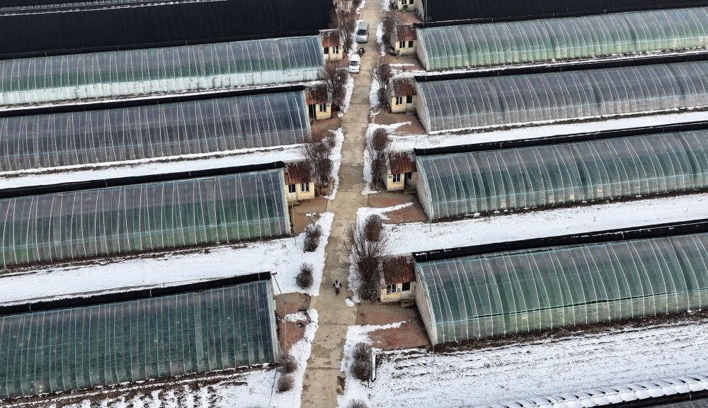 在天津市西青區(qū)辛口鎮(zhèn)水高莊村拍攝的修繕后的大棚一景(12月12日攝,無人機(jī)照片)。新華社記者 李然 攝
