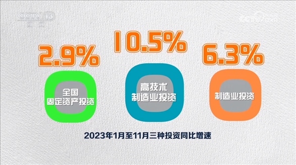 從投資看,2.9%、6.3%、10.5%,這三個(gè)數(shù)字分別是今年1—11月全國固定資產(chǎn)投資、制造業(yè)投資和高技術(shù)制造業(yè)投資的同比增速。