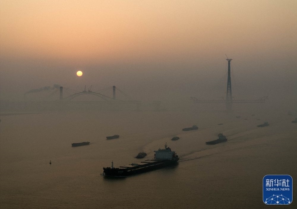 1月1日,船只在晨光中經(jīng)過位于江蘇省泰興市的常泰長江大橋建設(shè)現(xiàn)場(1月1日攝,無人機照片)。新華社發(fā)(湯德宏 攝)