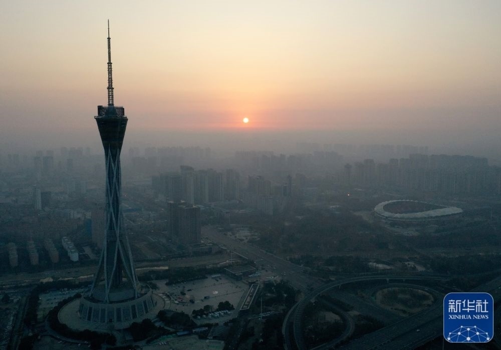 這是1月1日在河南省鄭州市中原福塔附近拍攝的日出(無人機照片)。新華社記者 李嘉南 攝
