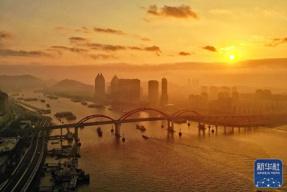 這是1月1日在海南自貿(mào)港重點園區(qū)——洋浦經(jīng)濟開發(fā)區(qū)拍攝的晨光(無人機照片)。新華社記者 蒲曉旭 攝