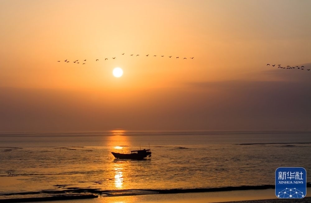 1月1日,在位于江蘇鹽城的中國黃(渤)海候鳥棲息地(第一期)核心區(qū)域東臺條子泥海濱,鳥兒迎著朝霞飛翔(1月1日攝,無人機照片)。新華社發(fā) (孫家錄 攝)