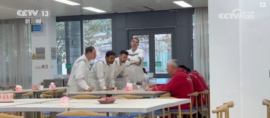 一輛輛各式各樣的自行車(chē)平穩(wěn)穿梭在安全區(qū),車(chē)上的工友有事兒就會(huì)互相召喚,拿出圖紙解決問(wèn)題,互通有無(wú)。而在職工和船東餐廳里,一張張餐桌上分區(qū)標(biāo)記了各個(gè)業(yè)主單位。吃完飯撤掉餐具,大家就開(kāi)始“頭腦風(fēng)暴”,現(xiàn)場(chǎng)辦公。