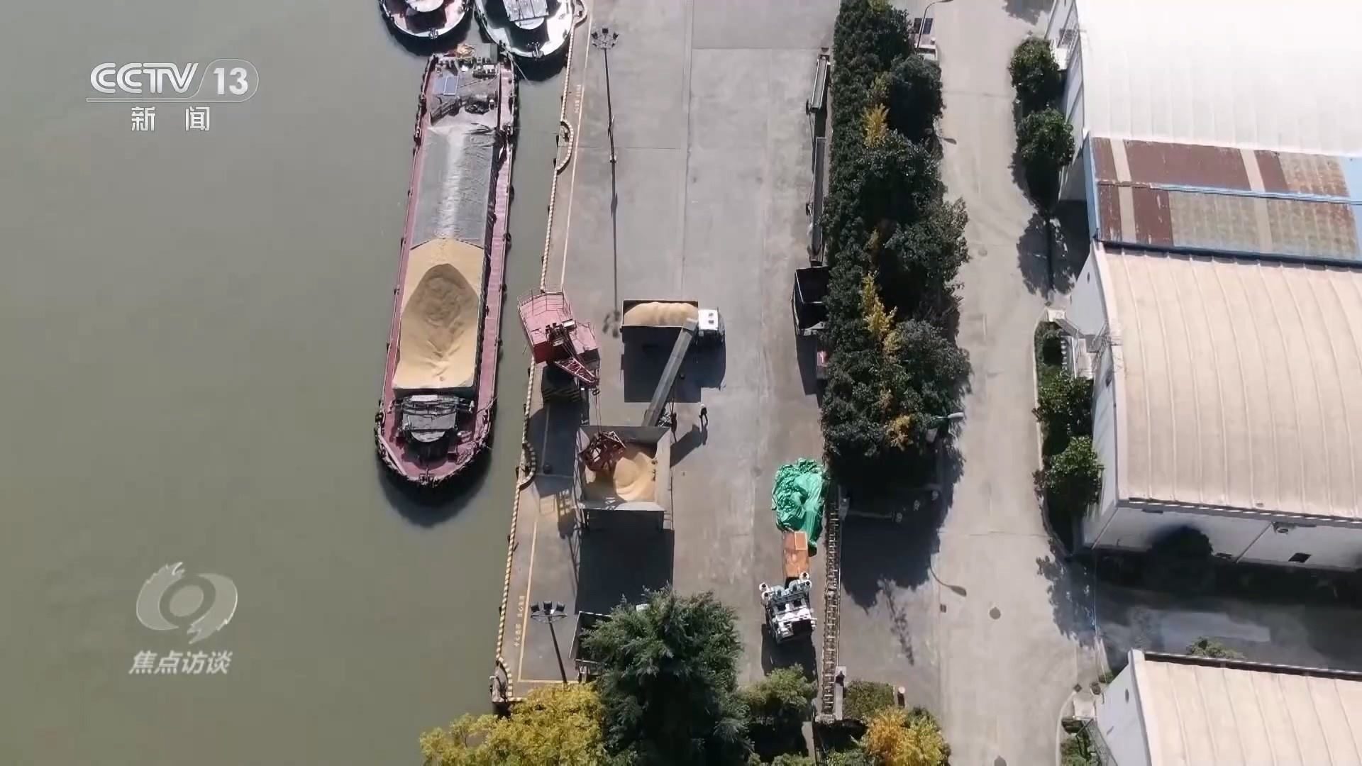 在京杭大運(yùn)河浙江余杭段的這個碼頭上,貨船上的稻谷正在被轉(zhuǎn)送到貨車上。碼頭旁是浙江省糧食局直屬糧油儲備庫,稻谷將被儲存在這些倉庫里。