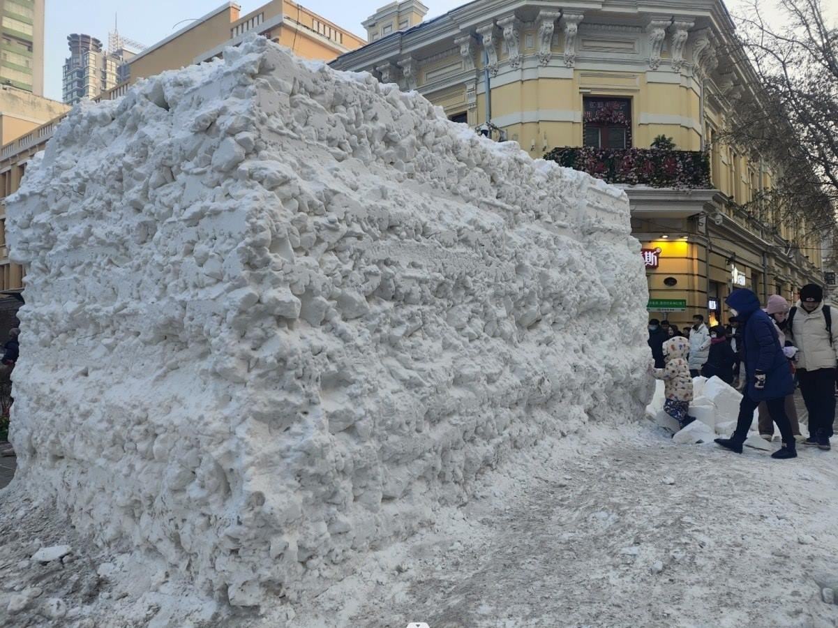 中央大街上,一間房大小的雪坯子到三米高的“五谷豐登”雪雕,從早上7點(diǎn)多一直到晚上9點(diǎn)多終于完工,包括臧洪洲在內(nèi)的三位雕刻師傅忙活了十多個(gè)小時(shí),除了午飯幾乎沒(méi)有休息,“比較細(xì)碎的雪渣,用鐵鍬清理不方便,就直接用手套和套袖一摟,一天下來(lái),手套全濕了。”