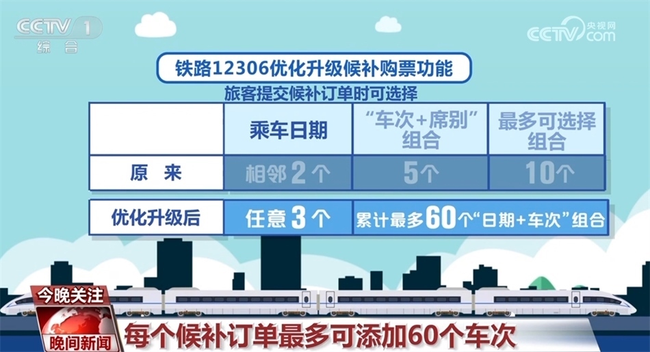 自1月11日零時起,鐵路12306優(yōu)化升級候補購票功能,來看一下具體變化:優(yōu)化升級后,每名旅客可提交的待兌現候補訂單數量由2個增至6個,每個訂單最多可添加9名乘車人;原來旅客提交候補訂單時,可選擇相鄰2個乘車日期、每個日期可選擇5個“車次+席別”的組合,最多可選擇10個組合。優(yōu)化升級后,旅客可選擇預售期內任意3個乘車日期,累計最多可選擇60個“日期+車次”的組合;原來候補訂單截止兌現時間最晚為開車前2小時,優(yōu)化升級后調整為開車前20分鐘。
