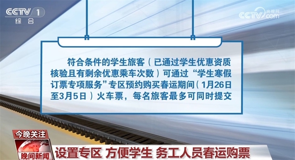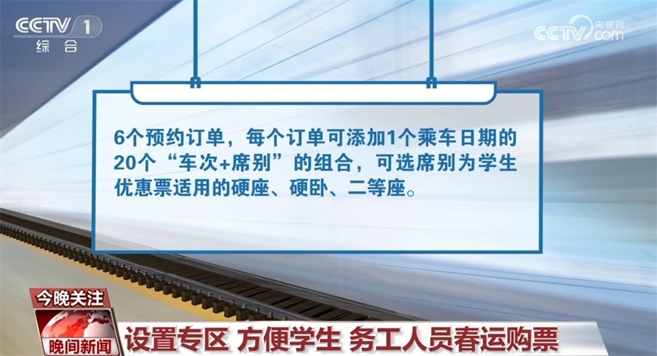 此外,符合條件的學生旅客(已通過學生優(yōu)惠資質核驗且有剩余優(yōu)惠乘車次數)可通過“學生寒假訂票專項服務”專區(qū)預約購買春運期間(1月26日至3月5日)火車票,每名旅客最多可同時提交6個預約訂單,每個訂單可添加1個乘車日期的20個“車次+席別”的組合,可選席別為學生優(yōu)惠票適用的硬座、硬臥、二等座。