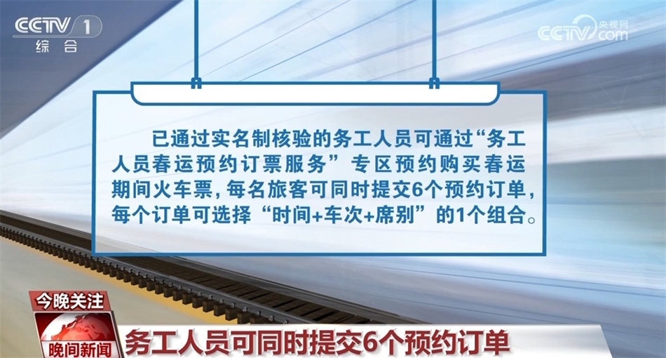 已通過實名制核驗的務工人員可通過“務工人員春運預約訂票服務”專區(qū)預約購買春運期間火車票,每名旅客可同時提交6個預約訂單,每個訂單可選擇“時間+車次+席別”的1個組合。