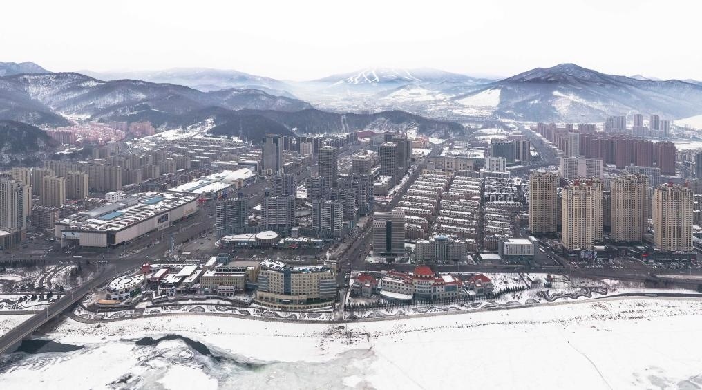 吉林省通化市城區(qū)和遠(yuǎn)處的萬峰通化滑雪度假區(qū)(無人機照片)。新華社記者 許暢 攝