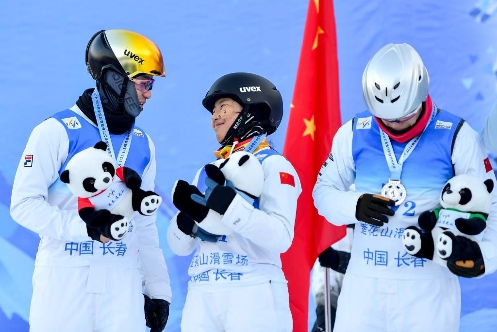 12月17日,獲得亞軍的中國二隊選手陳梅婷(中)、王心迪(右)和李天馬在頒獎儀式上。當(dāng)日,2023-2024賽季國際雪聯(lián)自由式滑雪空中技巧世界杯(中國長春分站賽)男女混合團(tuán)體決賽在吉林長春蓮花山滑雪場舉行。新華社記者 許暢 攝