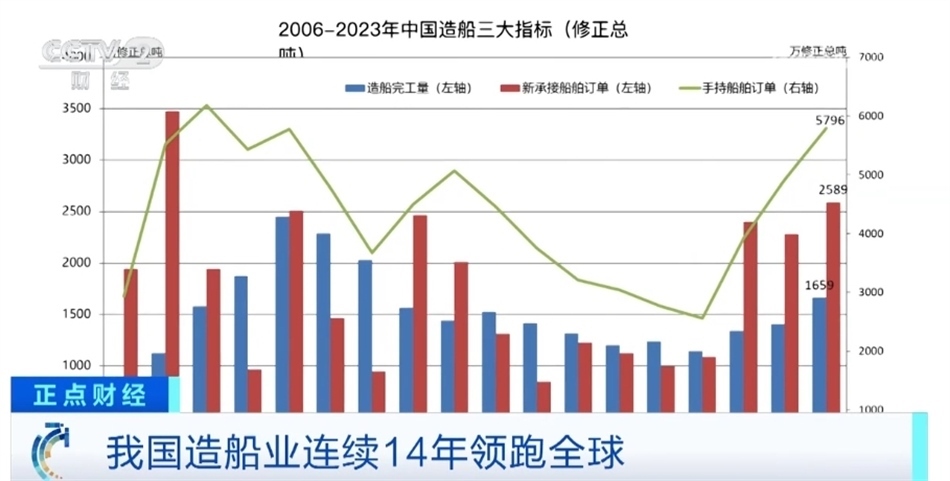 總臺(tái)央視記者 吳天白:在2023年中國(guó)造船業(yè)統(tǒng)計(jì)數(shù)據(jù)中,我們還可以看到三大指標(biāo)占國(guó)際市場(chǎng)份額分別是50.2%、66.6%和55.0%,首次全部超過(guò)50%。從這幾張數(shù)據(jù)圖中,我們可以看出,我國(guó)高技術(shù)、高價(jià)值船型的新接訂單量創(chuàng)2008年以來(lái)新高,在這里我們可以看到中國(guó)新接綠色動(dòng)力船舶訂單占國(guó)際市場(chǎng)的份額也是連年增長(zhǎng),2023年全年已經(jīng)達(dá)到了57%。這也表明了未來(lái)全球一半以上的新能源船都將產(chǎn)自中國(guó)。