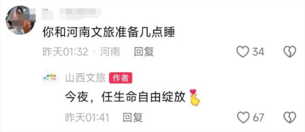 有網(wǎng)友稱“河南文旅按小時發(fā),咱們山西按分鐘發(fā)”,“山西文旅你勤快得讓我有點(diǎn)陌生”,凌晨,山西文旅小編仍在與網(wǎng)友互動——