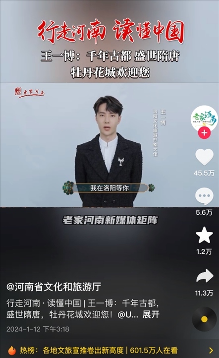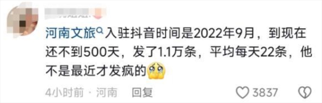 有人統(tǒng)計(jì),自1月9日起,河南文旅官方賬號“河南省文化和旅游廳”每天發(fā)布二三十條視頻,連續(xù)四天發(fā)布了112條視頻,持續(xù)展示本地文旅資源,吸引了近百萬新粉絲,主打一個“量變總會引起質(zhì)變”,以至于“河南文旅到底發(fā)了多少抖音”相關(guān)話題成為熱門搜索。