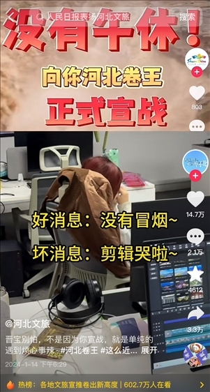有網(wǎng)友建議賬號改名為“河北文旅”,“不然都搜不到”,“聽勸”的官方賬號火速改名,并發(fā)布視頻“宣戰(zhàn)”,“山河四省互不內(nèi)卷?xiàng)l約正式結(jié)束,今天這個卷王我當(dāng)定了”,于是開始“瘋狂輸出”,日更75條,可還了得?