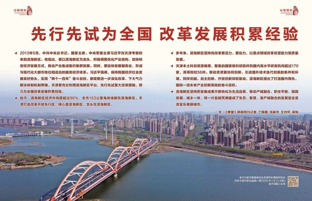 ◇2013年5月,中共中央總書記、國家主席、中央軍委主席習(xí)近平在天津考察時(shí)來到濱海新區(qū)。他指出,要以濱海新區(qū)為龍頭,積極調(diào)整優(yōu)化產(chǎn)業(yè)結(jié)構(gòu),加快轉(zhuǎn)變經(jīng)濟(jì)發(fā)展方式,推動(dòng)產(chǎn)業(yè)集成集約集群發(fā)展。同時(shí),要加快發(fā)展服務(wù)業(yè),形成與現(xiàn)代化大都市地位相適應(yīng)的服務(wù)經(jīng)濟(jì)體系。習(xí)近平強(qiáng)調(diào),保持我國經(jīng)濟(jì)社會發(fā)展良好勢頭,實(shí)現(xiàn)“兩個(gè)一百年”奮斗目標(biāo),都需要進(jìn)一步深化改革,下大氣力解決體制機(jī)制弊端。天津要充分利用濱海新區(qū)平臺,先行先試重大改革措施,努力為全國改革發(fā)展積累經(jīng)驗(yàn)。