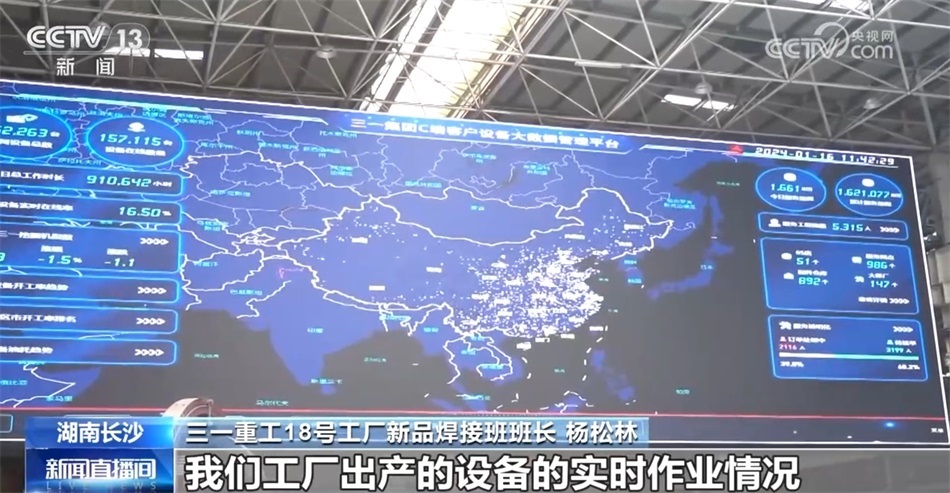 三一重工18號工廠新品焊接班班長 楊松林:來我們“燈塔工廠”參觀,我們都會看到一個超級大的屏幕,每一個閃光點(diǎn)都代表著我們工廠出廠的設(shè)備的實(shí)時作業(yè)情況。這些閃光點(diǎn)最后就形成了一個三一的挖掘機(jī)指數(shù),就相當(dāng)于我們業(yè)內(nèi)工程行業(yè)的一個晴雨表,其實(shí)我們還是挺自豪的。