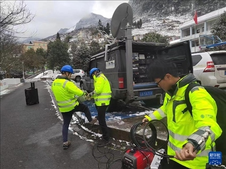 ?1月22日,工作人員在云南昭通市鎮(zhèn)雄縣山體滑坡災(zāi)害現(xiàn)場附近開展工作,保障救援現(xiàn)場通信暢通。新華社發(fā)