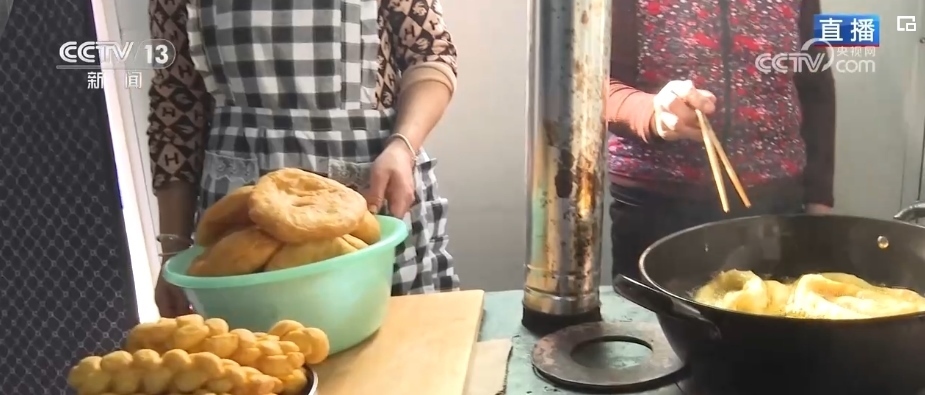 炸年饃是當(dāng)?shù)赝磷迦罕娪哟汗?jié)的傳統(tǒng)習(xí)俗。一家人齊上陣,這邊兩位大姐正在將發(fā)好的面揉好、揪出面劑子、搟成圓形、表面抹上清油,放進(jìn)油鍋里炸熟。對于土族群眾來說,進(jìn)入臘月之后就開始做年饃、宰年豬、置辦年貨,年味兒就濃了。炸年饃是當(dāng)?shù)厝罕娖碓感碌囊荒觑L(fēng)調(diào)雨順、五谷豐登、平安順?biāo)斓拿篮迷⒁?。制作年饃的面粉、菜籽油等材料都是政府給受災(zāi)群眾提供的物資。