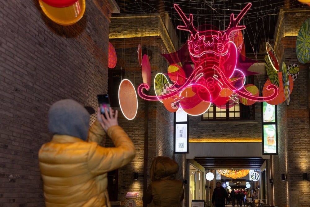 在上海市虹口區(qū)四川北路的“今潮8弄”,人們?cè)邶埬隉艄馑囆g(shù)裝置點(diǎn)綴的弄堂中拍照(2024年1月26日攝)。新華社記者 王翔 攝